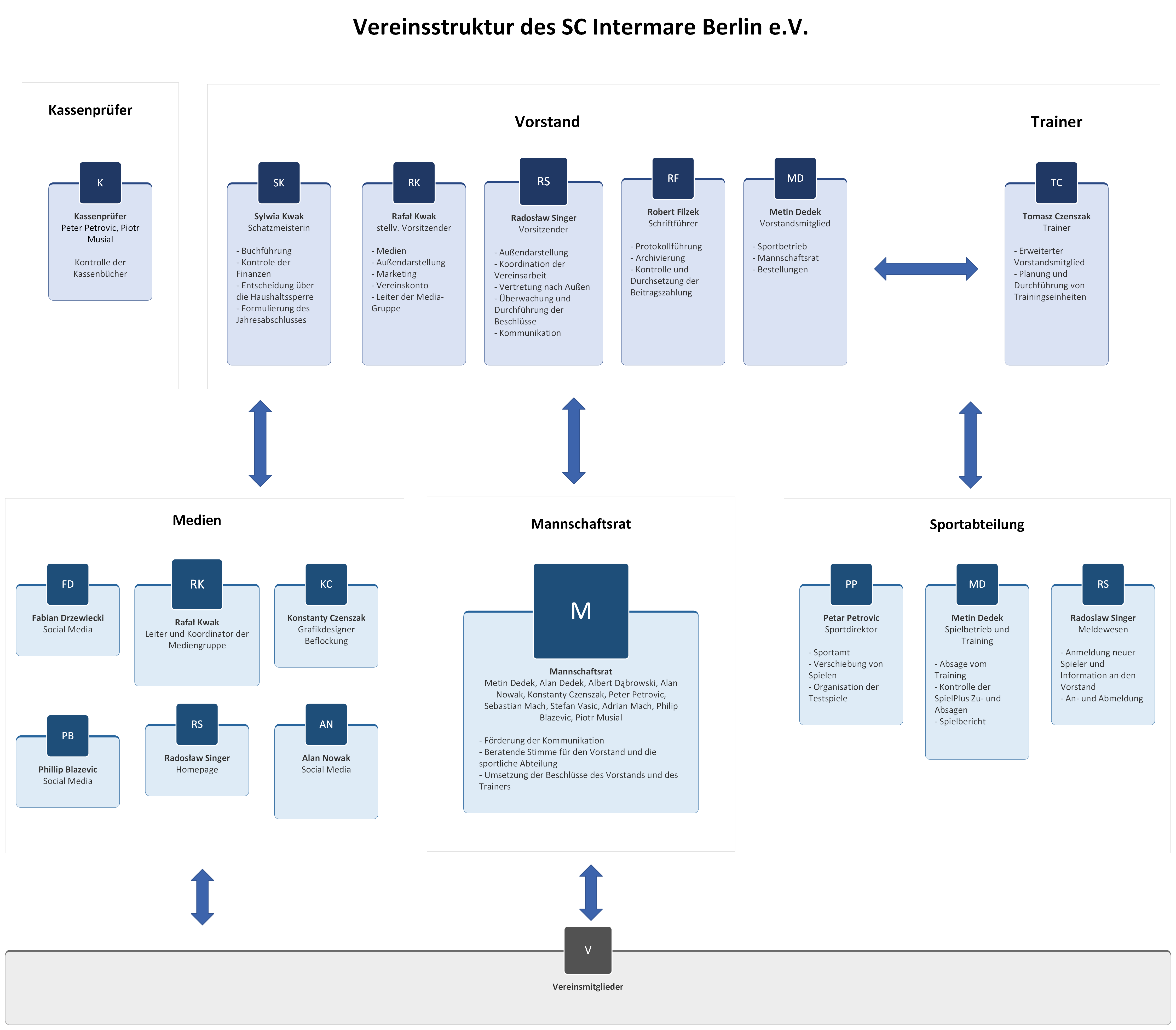 Um unser Vereinsleben noch effizienter und transparenter zu gestalten, haben wir unsere Strukturen überarbeitet und ein neues Organigramm erstellt. Mit klar definierten Aufgaben und Verantwortlichkeiten sorgen wir dafür, dass der SC Intermare Berlin e.V. weiterhin professionell geführt wird und unser Fokus auf dem sportlichen Erfolg und der Entwicklung unserer Mitglieder liegt. Unsere modernisierten Abläufe schaffen nicht nur mehr Übersichtlichkeit, sondern stärken auch die Kommunikation zwischen den Teams, Trainern und der Vereinsführung.